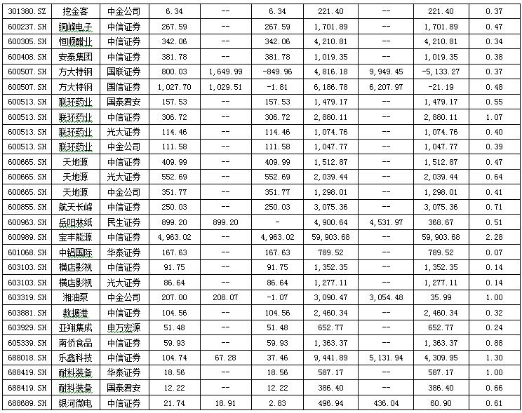 有增就有减。湘油泵(603319)、南侨食品(605339)、泰祥股份(301192)、岱勒新材(300700)、永安林业(000663)、方大特钢(600507)等6家公司在去年四季度遭到了券商的减持。遭减持幅股份最多的是方大特钢,数据显示,国联证券在去年四季度减持公司股份849.96万股,持股由1649.99万股,降至了800.03万股;与此同时,国信证券稍微减持了1.81万股,持股降至了1027.71万股。
