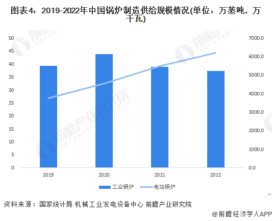 从我国工业锅炉供给规模看,2022年,我国工业锅炉产量达37.44万蒸吨,同比下降3.76%,同时,2019-2022年,中国电站锅炉产量逐年上升,截至2022年底,中国电站锅炉产量超过6000万千瓦。