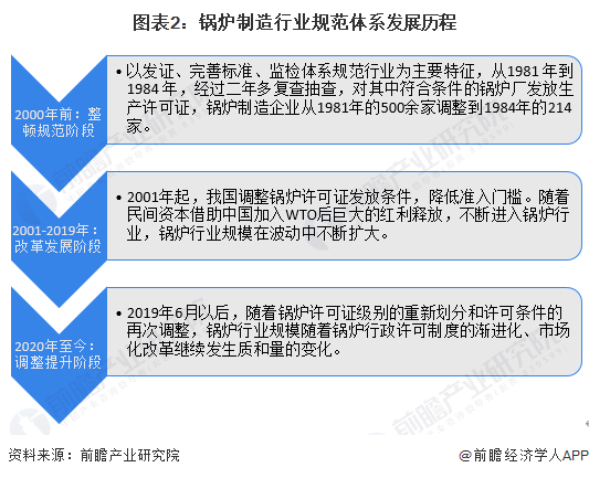 我国锅炉制造业是在新中国成立后建立并发展起来的。20世纪80年代初实行许可证管理以来,我国锅炉制造业取得了长足的进步,锅炉企业数量和产能不断扩大,锅炉企业一度达到1500多家。改革开放后,我国锅炉制造业规范体系分为三个阶段: