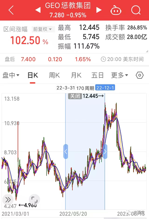 伯利重仓GEO的期间,这家上市公司股价最高涨幅超过100%,该股在今年一季度开始大幅下跌。伯利在此股的加仓与减仓步伐,都踏准了市场节奏。