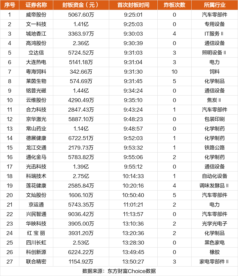从首次封板时间角度看,今日27只非ST股中,城地香江、高鸿股份、立达信等在开盘5分钟内首次触板。