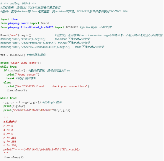 将TCS34725颜色传感器连接到Arduino板的I2C引脚(SCL和SDA),该Arduino板连接到Windows或Linux计算机。从I2CTCS34725颜色传感器中获取颜色值。