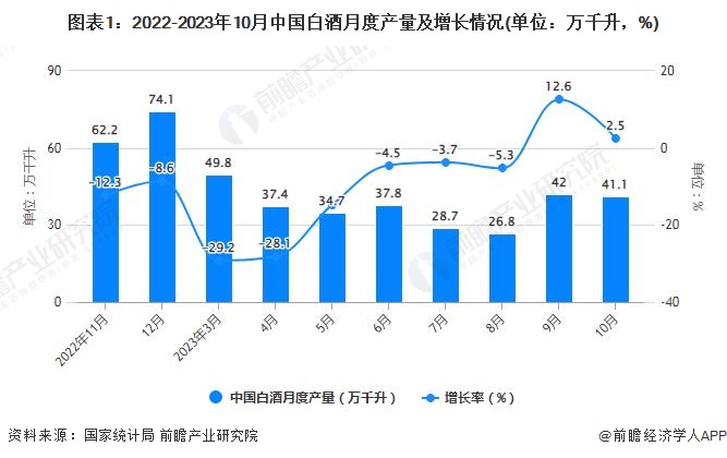 据国家统计局数据显示,2022年全年中国白酒累计产量达到671.2万千升,累计下降5.6%。截至2023年10月中国白酒产量为41.1万千升,同比增长2.5%。累计方面,2023年1-10月中国白酒累计产量达到347.8万千升,累计下降7.7%。
