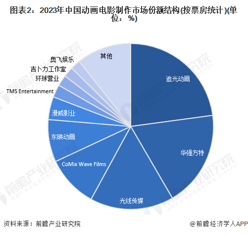 具体来看,追光动画、华强方特以及光线传媒所制作的动画作品取得的票房分别占据我国2023年动画电影票房的前三位,分别占比23%、19%以及16%。值得注意的是,包括CoMix Wave Films、东映动画、TMS Entertainment以及吉卜力工作室等厂商在内的日本动画制作厂商仍占据了我国动画电影较大部分的市场份额,根据前瞻统计,2023年,我国动画电影市场约25.53%的市场份额掌握在日本动画制作厂商的手中。