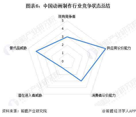 从动画制作行业现有竞争者情况来看,市场份额多集中于头部厂商,在现有参与者具有一定规模的情况下,存在一定的市场竞争;结合产业链的整体情况,由于我国动画制作厂商多采用海外软件进行动画制作,而国内的动画制作技术底座基础较为薄弱,可用、易用、好用的产品较少,因此供应商的议价能力极强;由于消费者可选择的动画作品较多,因此消费者具备一定的议价能力;由于动画制作行业技术壁垒和资金壁垒逐渐增高,且行业内部存在一定竞争,因此进入者威胁相对较小;替代品威胁上,中国动画制作行业面临海外动画制作厂商以及国产电视剧等多方面的威胁,因此替代品威胁较大。