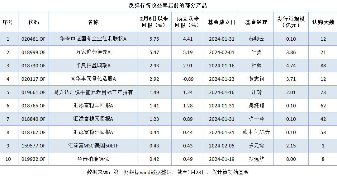 Wind数据显示,截至2月28日,有39只年内提前结募且成立的基金产品(仅计算初始基金)已有业绩表现。在2月6日以来的市场反弹行情中,有7只基金产品区间回报超过1%。
