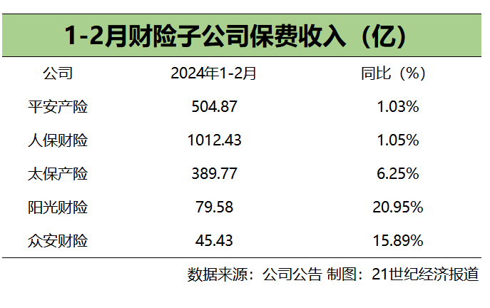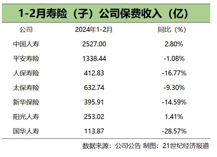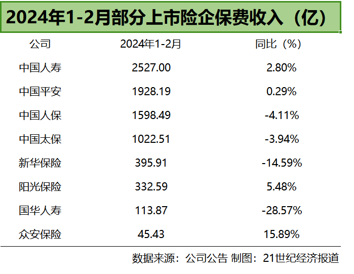近日,各家上市保险公司陆续公布1-2月保费收入。据21世纪经济报道记者统计,五家A股上市公司,前两月保费7472.09亿元 同比下降1.38%,其中三家出现负增长率,新华保险前两月原保费收入395.91亿元,同比下降14.59%;中国人保前两月原保费收入1598.49亿元,同比下降4.11%;中国太保前两月原保费收入1022.51亿元,同比下降3.94%。