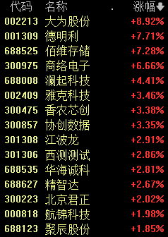 AI硬件端,存储芯片板块表现活跃,大为股份、德明利等股票大涨。