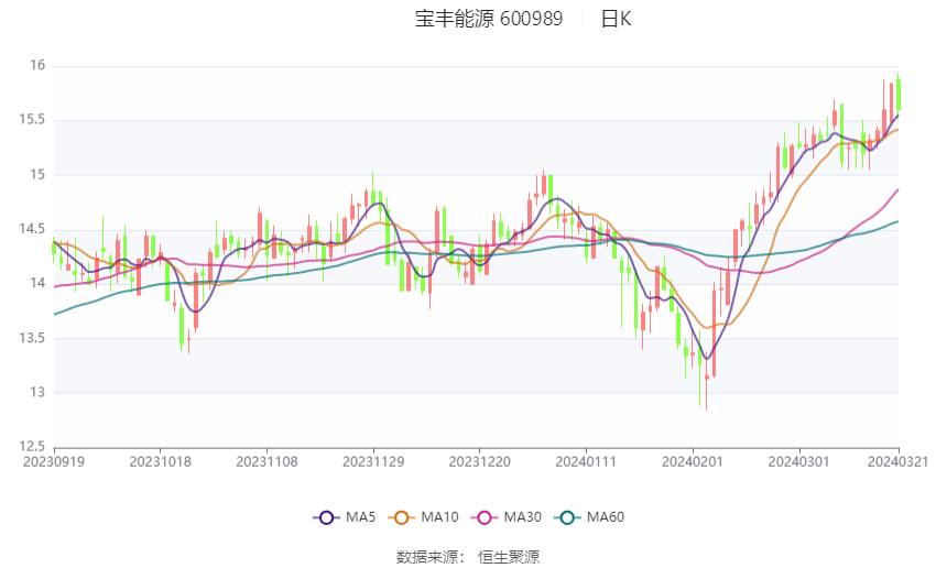 中证智能财讯 宝丰能源(600989)3月22日披露2023年年报。2023年,公司实现营业总收入291.36亿元,同比增长2.48%;归母净利润56.51亿元,同比下降10.34%;扣非净利润59.49亿元,同比下降11.46%;经营活动产生的现金流量净额为86.93亿元,同比增长31.19%;报告期内,宝丰能源基本每股收益为0.77元,加权平均净资产收益率为15.72%。公司2023年年度利润分配预案为:拟向全体股东每10股派3.158元(含税)。