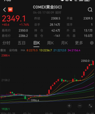 4月5日,COMEX黄金期货主力合约收涨1.6%,报2345.4美元/盎司,盘中再创历史新高2350美元/盎司,周涨幅4.8%。此外,现货白银也跟随上涨,涨幅超2%;COMEX白银涨超1%,SHEE白银涨近5%。