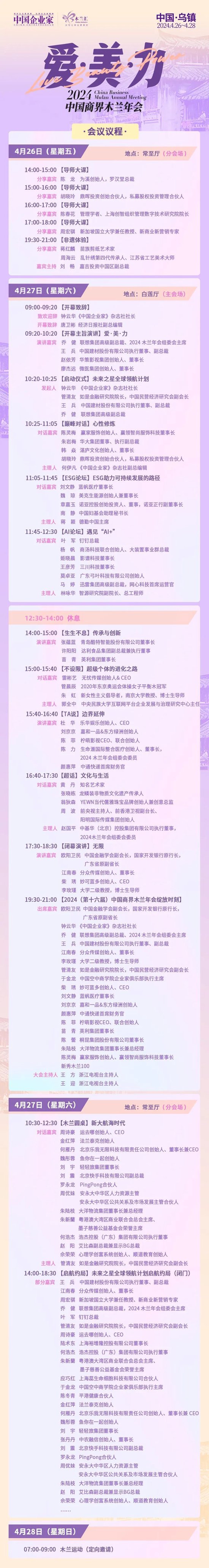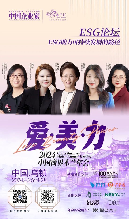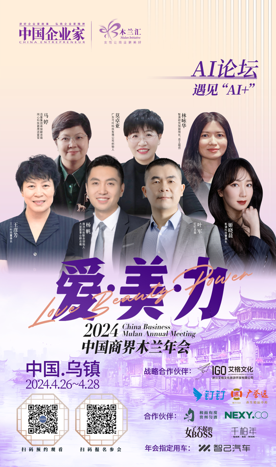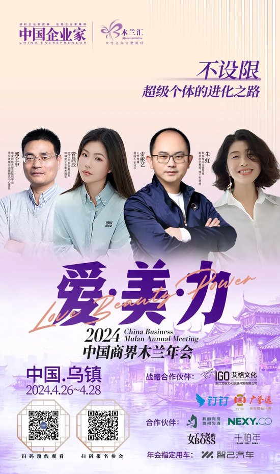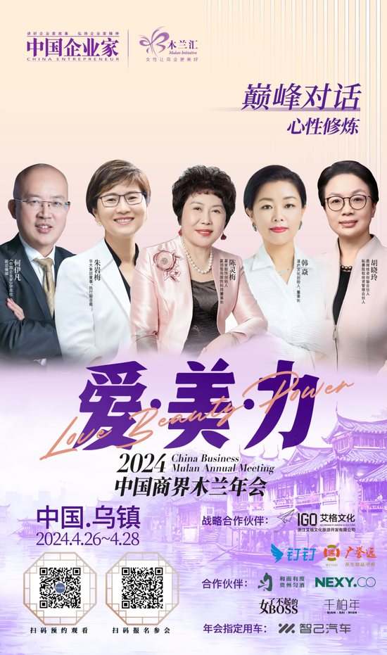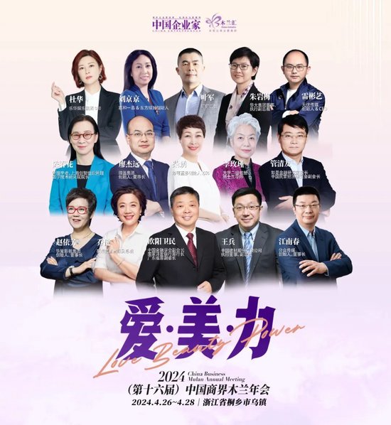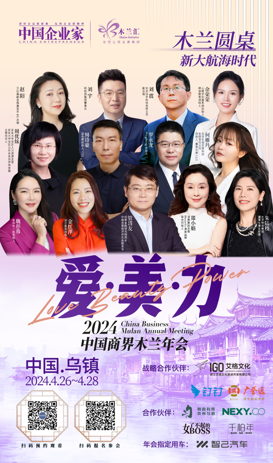 4月26日~28日,由《中国企业家》杂志社主办的第十六届中国商界木兰年会,将在浙江省桐乡市乌镇举办。本届年会主题是“爱·美·力”,共设有主旨演讲、巅峰对话、平行论坛等多个环节。