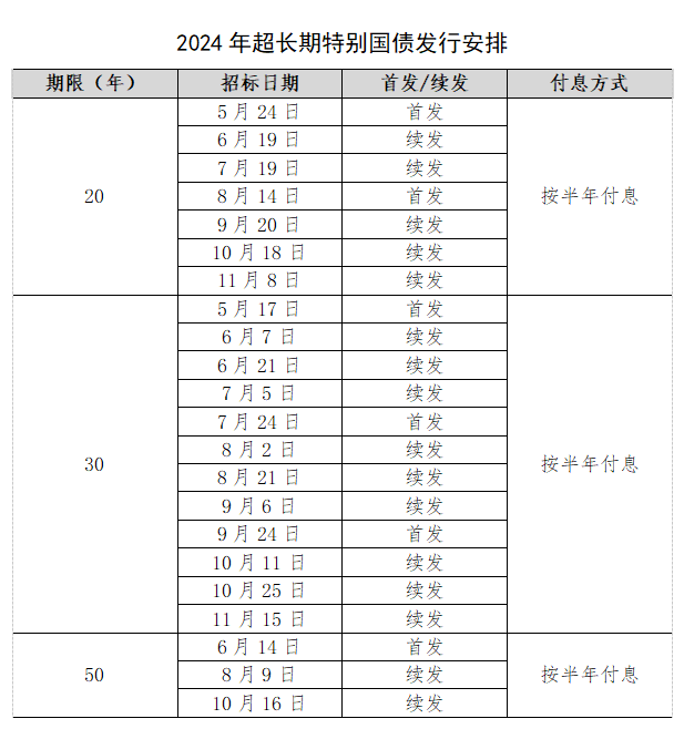 从整个1万亿元超长期特别国债发行安排来看,国债发行期限分别为20年、30年和50年,发行次数分别为7次、12次和3次,目前尚未公开具体每次发行金额,付息方式均为按半年付息,发行时间分布在5月中旬至11月中旬。