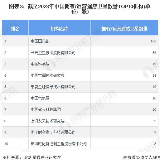 截至2023年5月1日,当前中国拥有/运营遥感卫星数量最多的机构是中国国防部,遥感卫星数量达到100颗;其次,长光卫星技术股份有限公司和中国科学院分别为第二和第三名,遥感卫星数量均超过15颗。