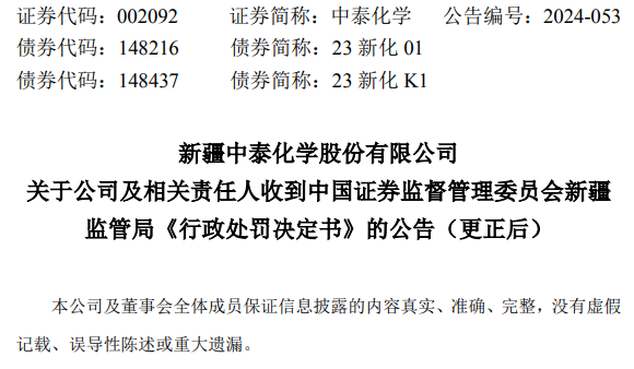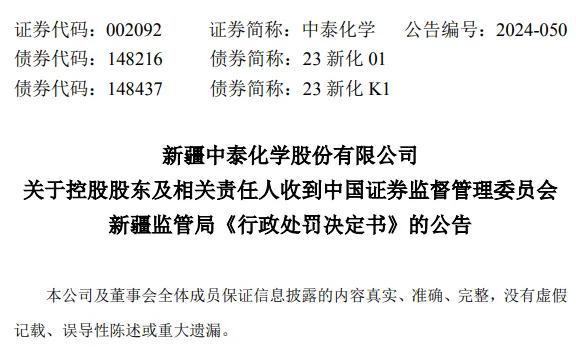 2024年5月17日,中泰集团及相关责任人收到新疆证监局出具的《行政处罚决定书》(〔2024〕4号),现将有关情况说明如下: