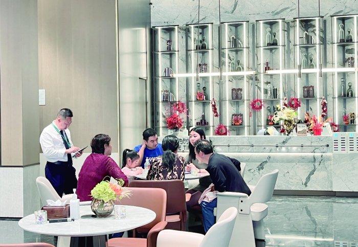 5月19日中午时分,该售楼处不仅沙盘前站了不少前来咨询的购房者,数张小圆桌周围也几乎坐满了人,样板房内更是挤了几拨看房的人。记者在该售楼处的近一个小时内,广播数次发出通知:某某幢某某号房源已成交。销售人员解释称,这样的广播是为了实时提醒销售人员某套房源已售出,不要再向客户推荐该房源。