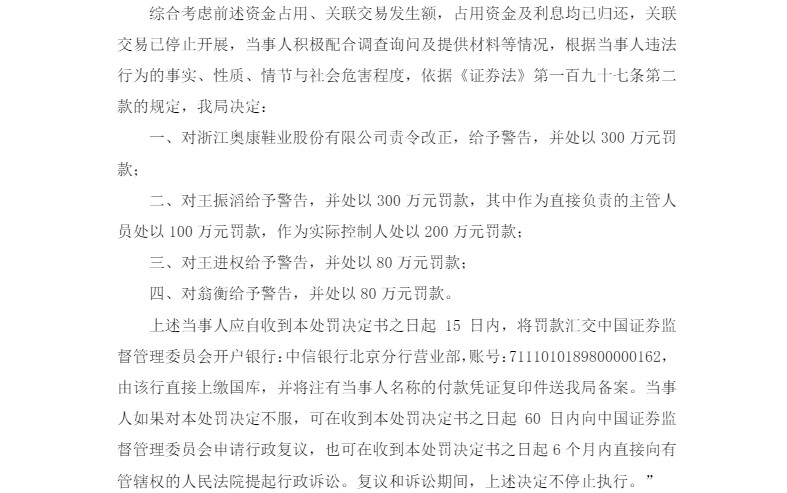 考虑到前述资金占用、关联交易发生额,占用资金及利息均已归还,关联交易已停止开展等情况,浙江监管局对奥康股份罚款300万元;王振滔罚款300万元,其中作为直接负责的主管人员处以100万元罚款,作为实控人处以200万元罚款;王进权、翁衡各罚款80万元,合共760万元。