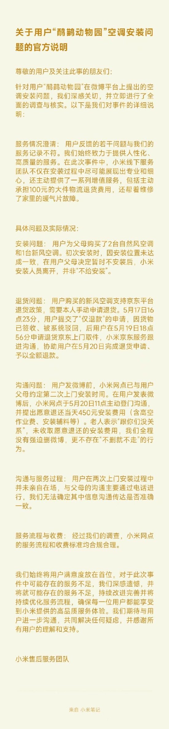 5月21日晚间,小米集团公关部总经理王化转发小米服务微博称:我们始终将用户满意度放在首位,对于此次事件中可能存在的服务不足,我们深感遗憾,并将就可能存在的服务不足,持续改进完善并将持续优化服务流程,确保每一位用户都能享受到小米提供的高品质服务体验。我们期待与用户进一步沟通,共同解决任何疑虑,并感谢所有用户的理解和支持。
