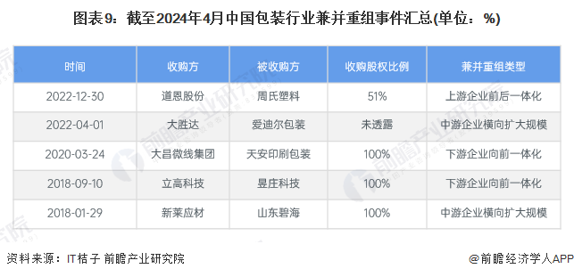 目前中国包装行业的兼并重组事件数量较少,截至2024年4月,仅有5起收购事件。兼并重组类型主要有下游企业向前一体化和中游企业横向扩大规模。