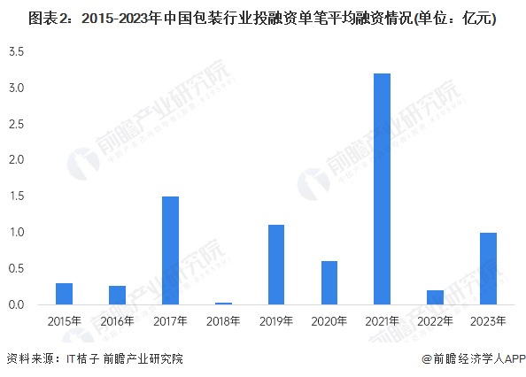 2015-2023年我国包装行业单笔平均融资金额整体呈波动趋势。其中2021年单笔平均融资金额最高超过3亿元,2023年行业的单笔平均融资金额在1亿元左右。