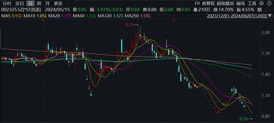 刚刚过去的端午小长假期间,一只频临退市的股票,突然引发了很大关注,在东财股吧中热度直线上升,跃升到了第7名。这只股票就是*ST洪涛(002325.SZ) ,截止到端午节放假前股价已下跌到了0.76元,且已是第6个交易所收在1元以下了,距离被锁定退市只有一步之遥。