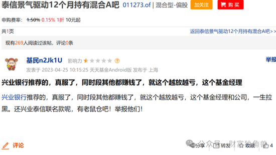 有基民表示,兴业银行推荐的,真坑人!跌了30%,不知什么时候能解套!以后坚决不买基,不会再信了!有基民回帖表示,又快一年了,还在亏。有基民甚至表示,兴业银行推荐的,真服了,同时段其他都赚钱了,就这个越放越亏,这个基金经理和公司,一生拉黑。还兴业泰信联名款呢,有老鼠仓吧!举报他们!