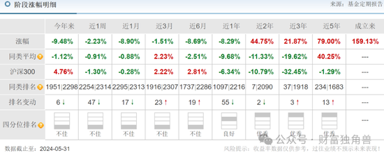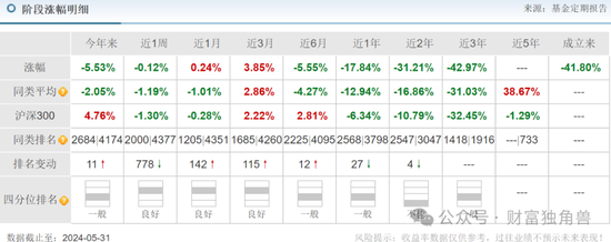 笔者发现,该基金还在2023年2季度持有1.40万股的华数传媒,到了2023年3季度有没了持仓,但在这期间华数传媒股票价格下跌了14%。然而,该基金又在2023年4季度持有9.07万股,2024年1季度持有8.81万股。从2023年10月9日-2024年5月30日华数传媒股票价格下跌了11.85%。