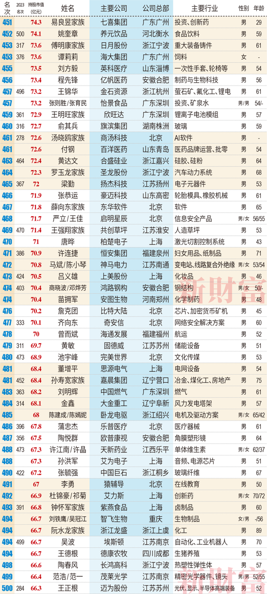2024新财富500创富榜的候选人需满足4个条件:1、在中国成人;2、来自商界;3、个人持股市值不低于66.3亿元;4、主要业务在中国内地。