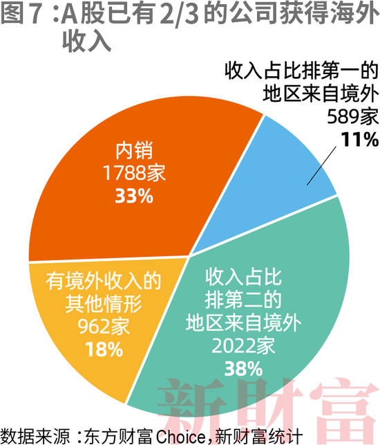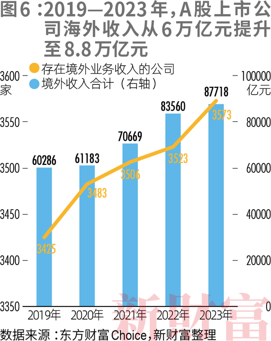 据新财富统计,截至2024年5月20日,全部A股5361家上市公司中,披露存在港澳台及海外业务收入的公司达到3573家,占比为2/3,它们合计获得8.8万亿元海外收入,较2019年的6万亿元提升了47%(图6)。