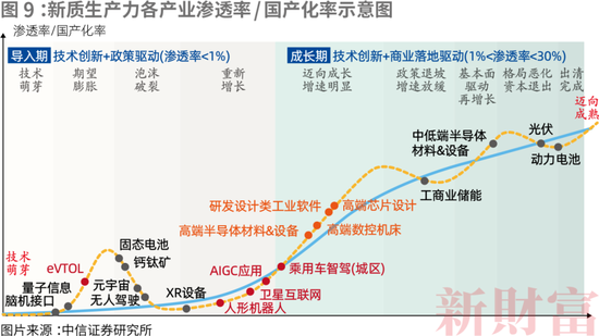 据中信证券研究,渗透率和国产化率逐渐提升的领域,资本会逐渐退出,转而捕捉还在萌芽的,更为新兴的赛道。如光伏和动力电池就已迈向成熟期,而尚处于发展早期的乘用车智驾、AIGC应用、卫星互联网、人形机器人等赛道,则获得越来越多资本的关注(图9)。创富榜上,这些赛道的相关企业也已崭露头角。但可以预见的是,它们将同样趟过和前辈一样的路,直面产能周期、贸易壁垒等多重挑战。