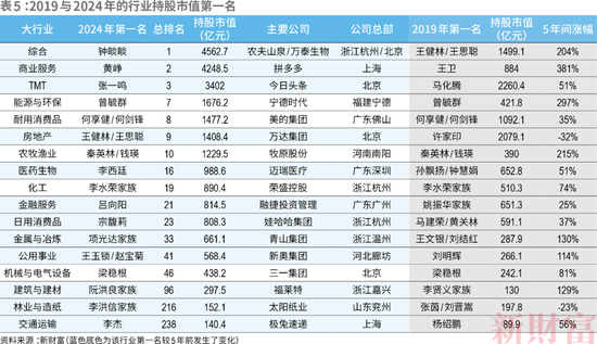 不同行业创富势能的抑扬,是经济结构重心的迁移。同一行业,持股市值排名第一的首富的轮替,则更多体现了商业模式、战略眼光甚至企业家情怀格局的差异(表5)。