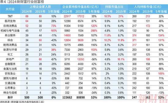 以新质生产力主要涉及的TMT、医药生物、机械与电力设备、耐用消费品、能源与环保领域来看,这五大行业合计上榜260名企业家,较5年前(199人)提升30%;而他们的持股总市值为5.9万亿元,较5年前增长了80%。创富榜上,新质生产力已贡献半壁江山,成功填补了地产企业家下滑带来的空缺。