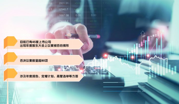 随着年度股东大会的陆续召开,上市公司议案被否的现象频出。据上海证券报记者统计,目前已经有45家上市公司出现年度股东大会上议案被否的情形,否决议案数量超80项,涉及年度报告、定增计划、高管选举等方面。