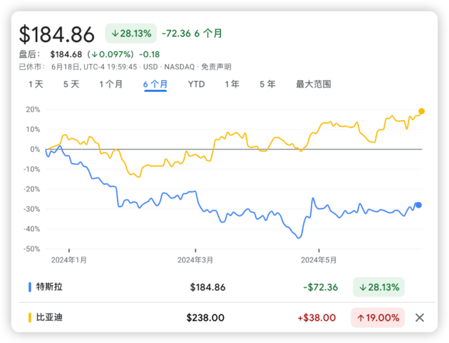 作为全球新能源车企的销量冠军,比亚迪在中国市场的表现力压特斯拉。过去半年里,比亚迪H股上涨19%,跑赢大盘,而特斯拉则重挫28%。
