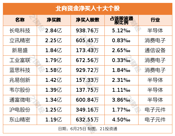 个股方面,北向资金净买入长电科技(600584.SH)、立讯精密(002475.SZ)、新易盛(300502.SZ)、工业富联(601138.SH)、蓝思科技(300433.SZ)居前,其中,长电科技被净买入2.84亿元,立讯精密被净买入2.25亿元,新易盛被净买入1.84亿元,工业富联被净买入1.79亿元,蓝思科技被净买入1.58亿元。