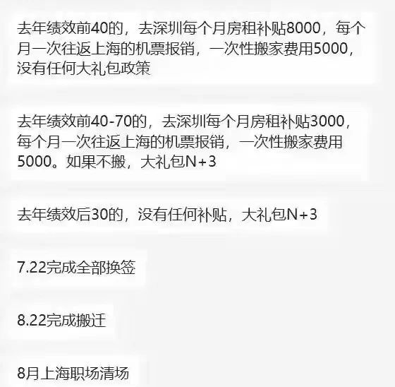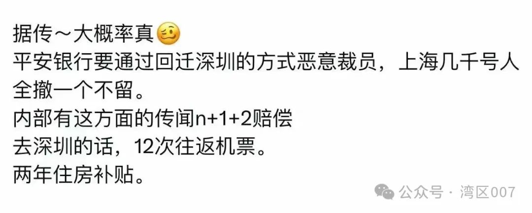 据传~大概率真,平安银行要通过回迁深圳的方式恶意裁员,上海几千号人全撤一个不留。内部有这方面的传闻n+1+2赔偿去深圳的话,12次往返机票。两年住房补贴。
