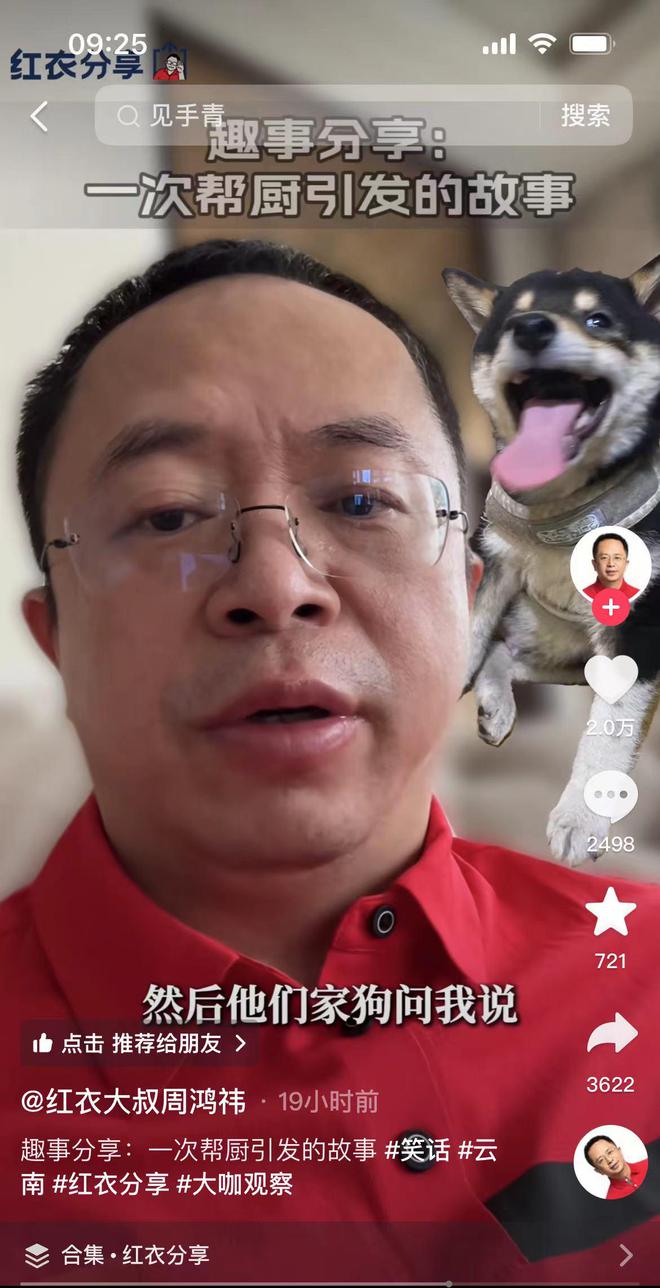 周鸿祎称其在朋友家帮厨时吃了两口菌子,后来看见他们家狗走进来问周鸿祎:“炒好了吗?最后要不要勾点芡?再加点味精。”