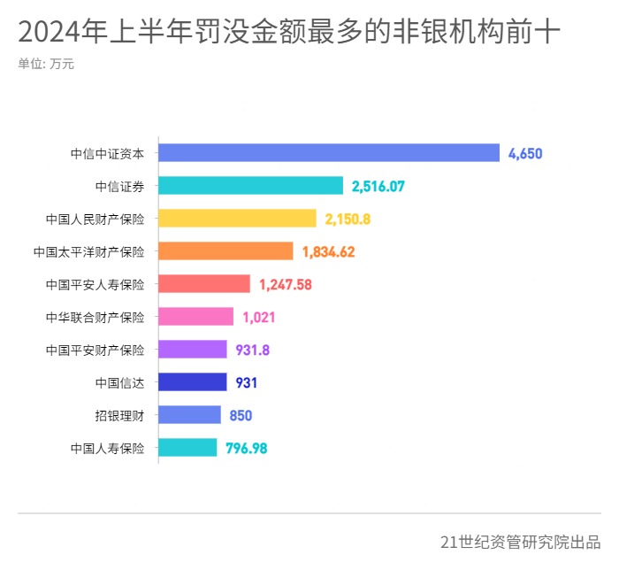 三、非银处罚排名:中国人民财产保险罚单最多,中信中证资本被罚没金额排第一