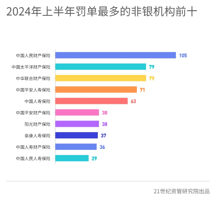 今年上半年罚单数量前十的非银机构均为保险公司,其中中国人民财产保险的罚单最多,有105张罚单,涉及较多的违规行为有虚假列支与套取费用、编制虚假资料、虚假承保理赔、理赔不及时、利用保险业务为其他个人或机构牟取不正当利益,以及未按照规定使用经批准或者备案的保险条款、保险费率等。