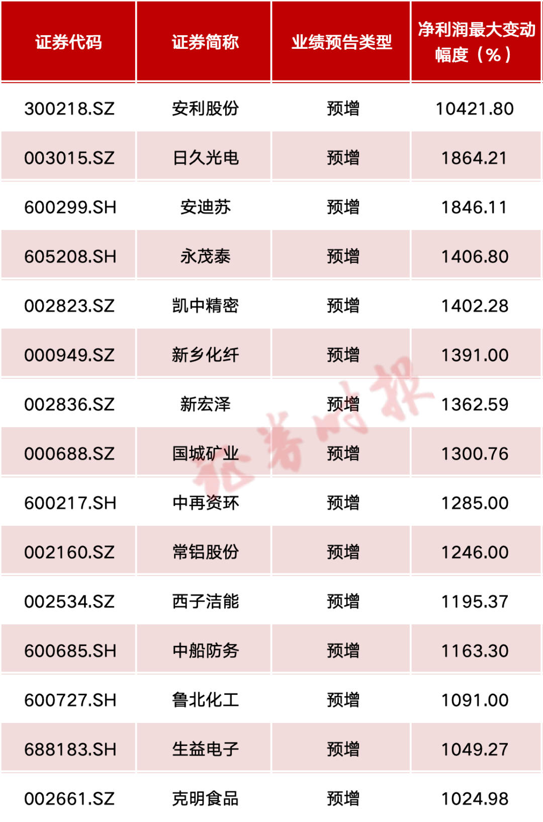 其中,在业绩预告类型为“预增”的公司中,安利股份、日久光电、安迪苏(600299)和永茂泰等15家公司的半年度净利润最大增幅均在1000%以上。