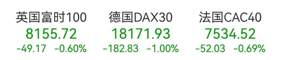 欧洲三大股指当天也全线下跌,英国伦敦股市《金融时报》100种股票平均价格指数19日报收于8155.72点,较前一交易日下跌49.17点,跌幅为0.60%。法国巴黎股市CAC40指数报收于7534.52点,较前一交易日下跌52.03点,跌幅为0.69%;德国法兰克福股市DAX指数报收于18171.93点,较前一交易日下跌182.83点,跌幅为1.00%。