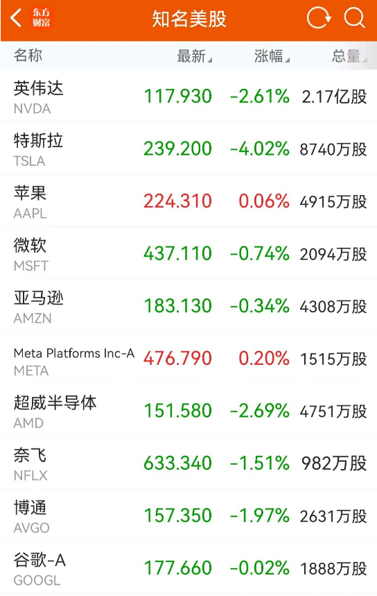 大型科技股多数下跌,特斯拉跌超4%,英特尔跌超5%,格芯跌近5%,德州仪器、阿斯麦跌超3%,英伟达、AMD跌逾2%,奈飞跌超1%,谷歌、亚马逊小幅下跌;苹果、Meta小幅上涨。