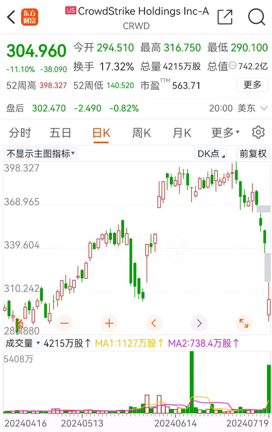 受“微软蓝屏”事件影响,网络安全软件公司CrowdStrike周五收盘大跌超11%。