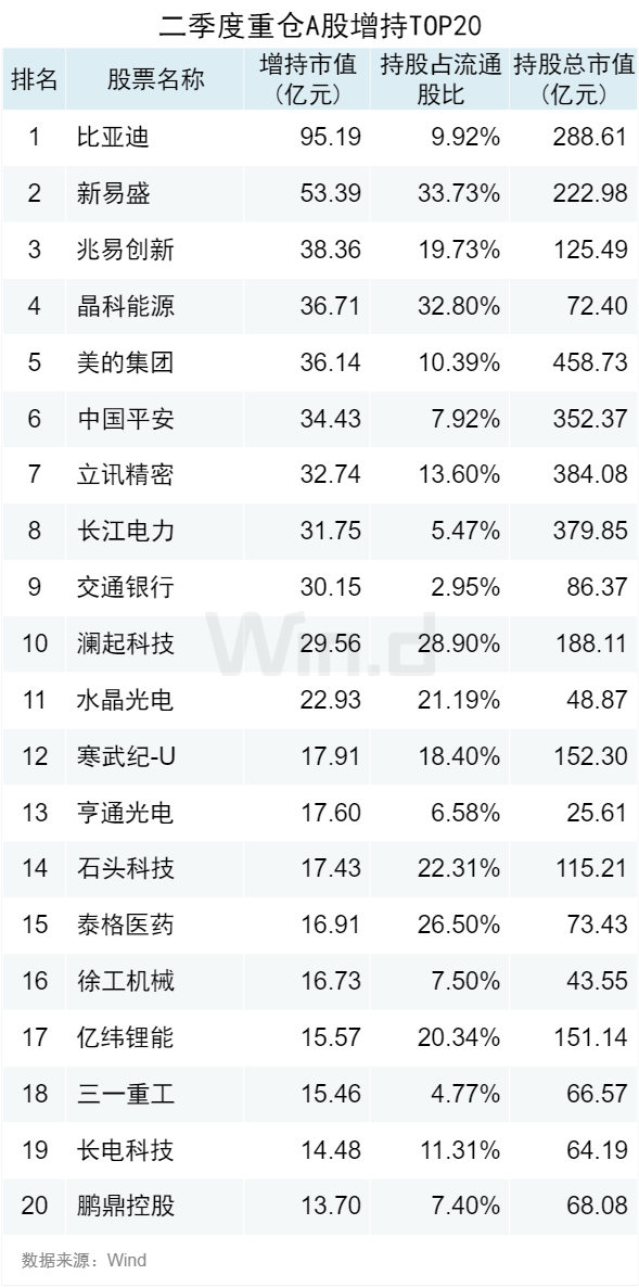 另从增持情况来看,Wind数据显示,截至二季度末,公募基金合计增持市值最多的三只个股是比亚迪(002594.SZ)、新易盛(300502.SZ)、兆易创新(603986.SH),增持市值分别为95.19亿元、53.39亿元、38.36亿元;晶科能源(688223.SH)、美的集团、中国平安(601318.SH)、立讯精密、长江电力、交通银行(601328.SH)则均获增持超30亿元。