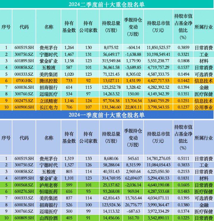 7月19日,公募基金2024年二季度报告已全部披露完毕,最新数据显示,在2024年二季度报告中,公募基金的前十大重仓股依次为:贵州茅台(600519.SH)、宁德时代(300750.SZ)、紫金矿业(601899.SH)、五粮液(000858.SZ)、美的集团(000333.SZ)、腾讯控股(00700.HK)、招商银行(600036.SH)、迈瑞医疗(300760.SZ)、立讯精密(002475.SZ)、长江电力(600900.SH)。