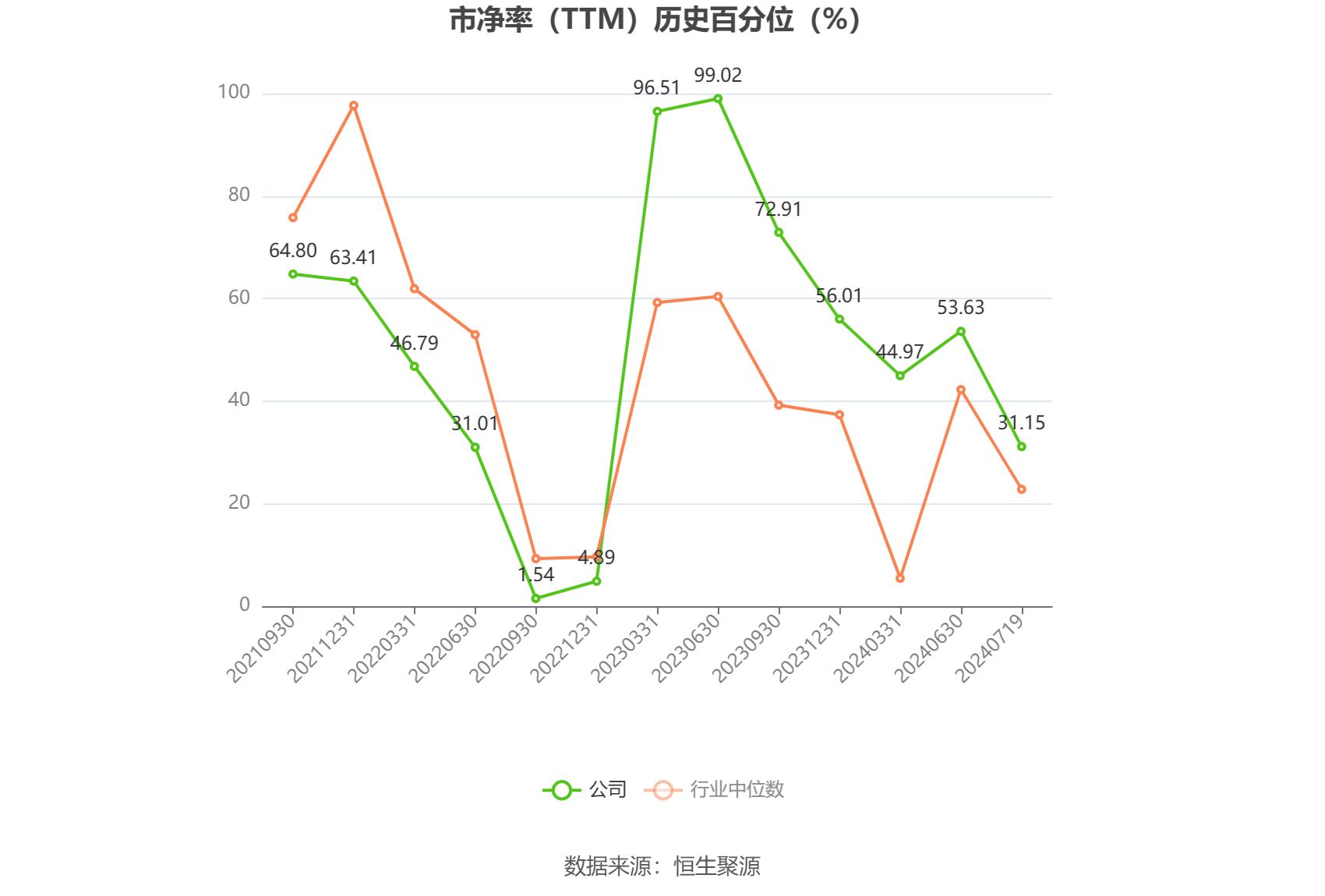 市盈率为负时,不显示当期分位数,会导致折线图中断。