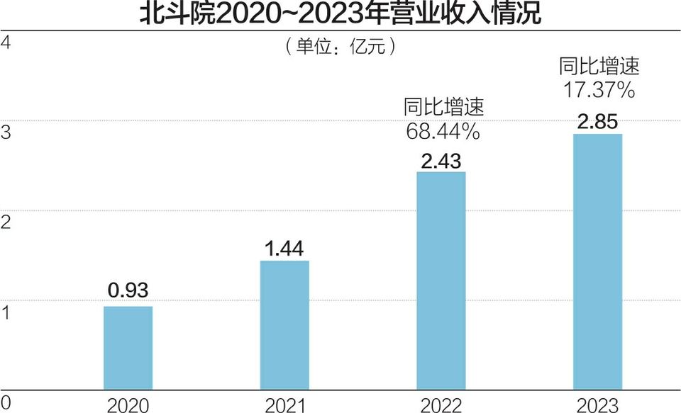 从业绩来看,2020~2022年,北斗院分别实现营业收入9349.85万元、1.44亿元、2.43亿元,复合增长率为61.16%,其中2022年收入增幅为68.44%。按照更新的财务数据,北斗院2023年营业收入为2.85亿元,同比增幅为17.37%,相较2022年增速明显放缓。