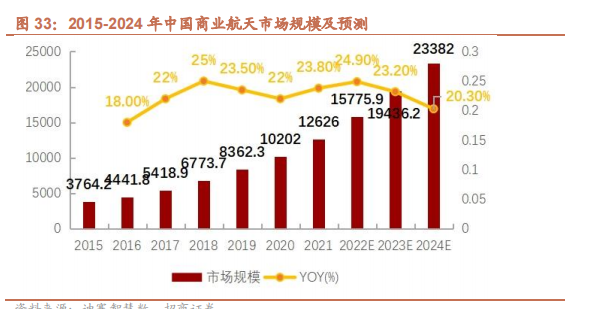 我国商业航天市场规模自2015年以来保持高速增长,2017年至2024年年增长率保持在20%以上,根据迪赛智慧数预计,2024年商业航天市场规模将达23,382亿元。