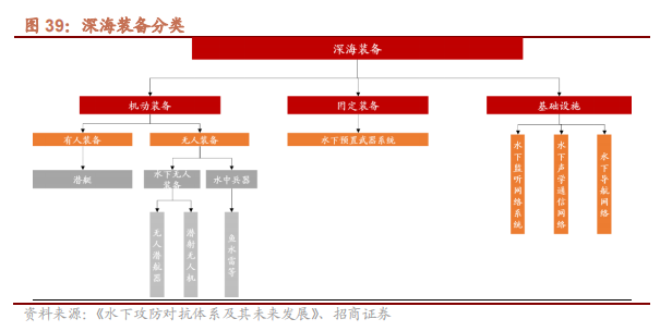 根据解放军报发布的《呼之欲出的深海空间作战》,深海具有独特的战场空间攻防作战优势,是军事力量对抗最具潜力的战略空间之一。随着深海科技发展和在军事领域的广泛应用,深海作战隐蔽性强、溯源难、节奏快等特征愈发突显。根据深海对抗能力及装备形式,可将深海装备分为:机动装备、固定装备以及基础设施。