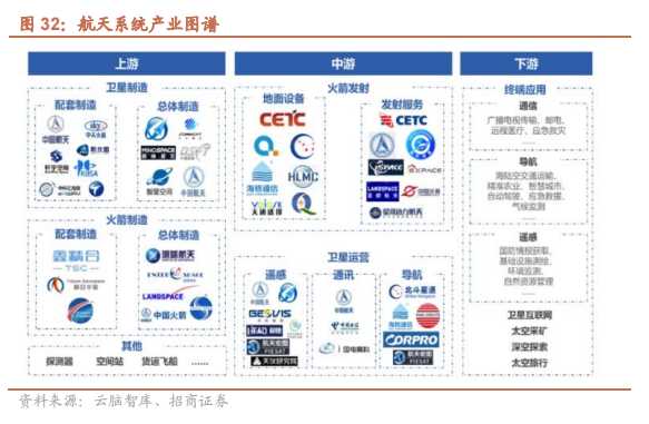 大国安全与商业价值双重驱动着卫星互联网的发展。航天系统产业链上游主要为卫星与火箭制造商,可进一步细分为配套设备制造与总装。卫星及火箭配套设备包括航天用连接器、微特电机、MLCC、电子元器件、微波毫米波射频芯片、星载计算机、恒星敏感器、天通基带芯片等。中游为火箭发射与卫星运营服务商。发射环节,卫星由商业火箭运载,在发射场依靠地面设备辅助实现发射,火箭发射场地包含海陆空三类,我国陆上基地有酒泉、太原、西昌、文昌四大发射中心;海上基地有海阳产业基地;空中火箭发射尚未实现。卫星运营即卫星测运控,指通过使用专业设备和软件,实现卫星位置追踪、卫星特殊事件预报、卫星轨道和姿态管理以及卫星业务数据的上传、下载、处理、显示与交付。下游则为应用环节。传统应用场景包括:通信(广播电视传输、邮电、远程医疗、应急救灾等)、导航(海陆空交通运输、精准农业、智慧城市、自动驾驶、应急救援、气候监测等)、遥感(国防情报获取、基础设施测绘、环境监测、自然资源管理等),新兴应用场景包括卫星互联网、太空旅行、太空采矿、深空探索等。