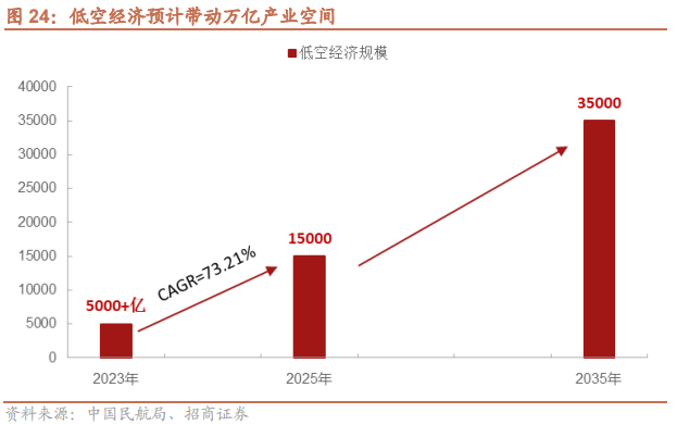 到2025年,中国低空经济的市场规模预计将达到1.5万亿元,到2035年更是有望达到3.5万亿元。根据民航局统计报道,截至2023年底,我国通航企业达689家,在册通用航空器3173架,通用机场451个,全年作业飞行135.7万小时,近三年年均增速达到12%,无人机设计单位大概有2000家,运营企业接近20000家,国内注册无人机126.7万架,同比增长32.2%,飞行2311万小时,同比增长11.8%。无人机为低空经济的重要组成部分。根据赛迪顾问,预计2025年我国民用无人机产业规模将突破2000亿元,工业级无人机将成主力机型,eVTOL(电动垂直起降飞行器)将成为新起之秀,快速推进商业化。